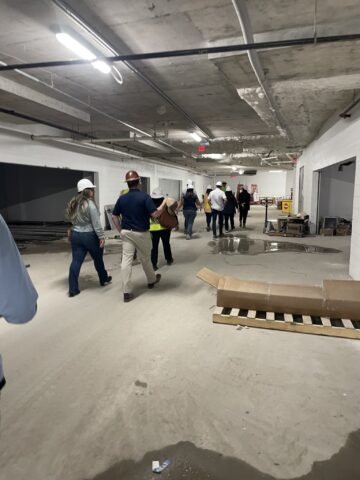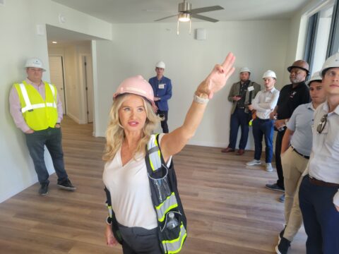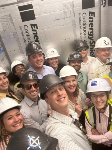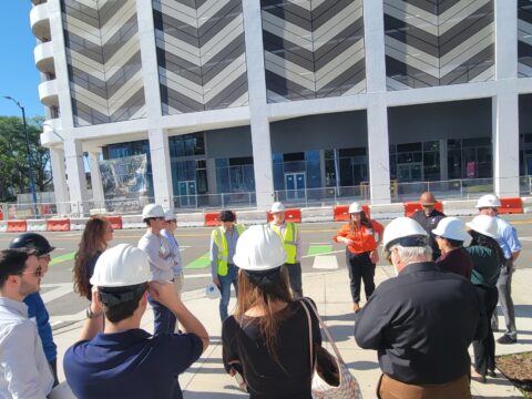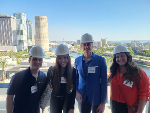 Our YLG members gather in front of the AER Tampa Apartments and put on their hard hats before beginning their tour.