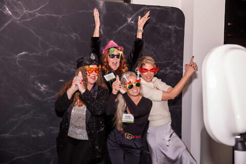 Group photo of attendees spreading holiday cheers in the photobooth at the ULI Tampa Bay Holiday Bash 2023 on December 6, 2023.