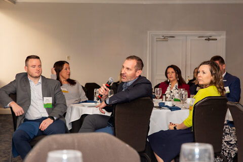 One of our attendees ask a question for the the panelists during the January StimULI Breakfast, Hasta la Vista: AI in Real Estate.