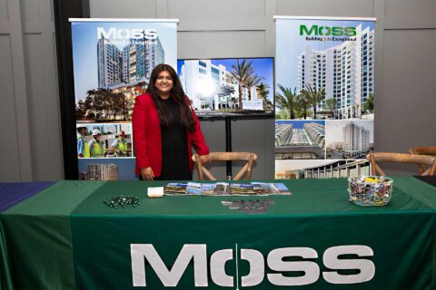 ULI Tampa Bay member, Stuthi Ponnala, poses with Moss’ promotional table at the 2023 Trends Conference as part of their sponsorship benefits!